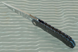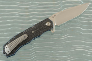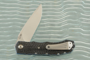 The scales are formed from 3D contoured silver strike carbon fiber. This variation of lightning strike carbon fiber uses aluminum wire (rather than copper) woven through the carbon strands. Jimping on the thumb ramp aids grip. The flipper doubles as a front guard that keeps the hand from sliding forward onto the blade. The gently rounded handle feels sturdy and fills out the hand perfectly. The handle is completed with blue anodized titanium liners that elegantly contrast against black carbon fiber scales. The titanium liners are hand fileworked. The pivot is surrounded by a zirconium pivot collar. The machined titanium pocket clip is mounted for right-handed, tip-up carry and features a ceramic ball for excellent pocket retention.