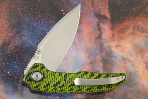 Handle scales are formed from green/black carbon fiber. Jimping on the thumb ramp aids grip. The gently rounded handle feels sturdy and fills out the hand perfectly. A zirconium pivot collar surrounds the titanium pivot and creates an elegant focal point. The handle is completed with blurple anodized titanium liners. The ultra-light titanium pocket clip is mounted for tip-up, right-handed carry.