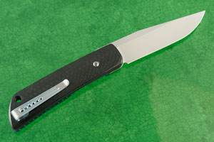 Gloss carbon fiber scales rest on blue anodized titanium liners keeping this knife as light as it comes. A carbon fiber backbar matches the scales and keeps the knife rigid yet light. An elevated jimped thumb ramp provides for a secure thumb purchase. A machined titanium pocket clip is mounted for right-handed, tip-up carry and is anodized.
