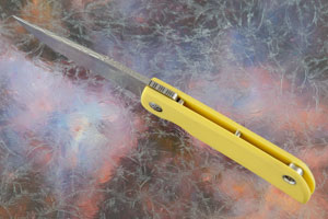 Description: This ultra-light folder is an exceptional EDC. The low care, high performing stainless damascus blade will take a sharp edge and hold onto it. Yellow G-10 scales ensure this knife is easy to locate. At just 1.6 oz, it will be easy to keep close at hand. This is a perfect hiking and backpacking folder when every oz matters.