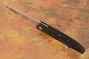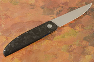 The blade is perfectly centered and has smooth action. It is easily opened using the front flipper mechanism. This style of flipper is not designed to be flicked open, but instead is rotated with the thumb. The lock bar is grade V Titanium with a silicon nitride detent ball (Hrc 93!). The gently rounded marbled carbon fiber handle feels comfortable in the hand, despite being so inobtrusive.