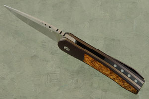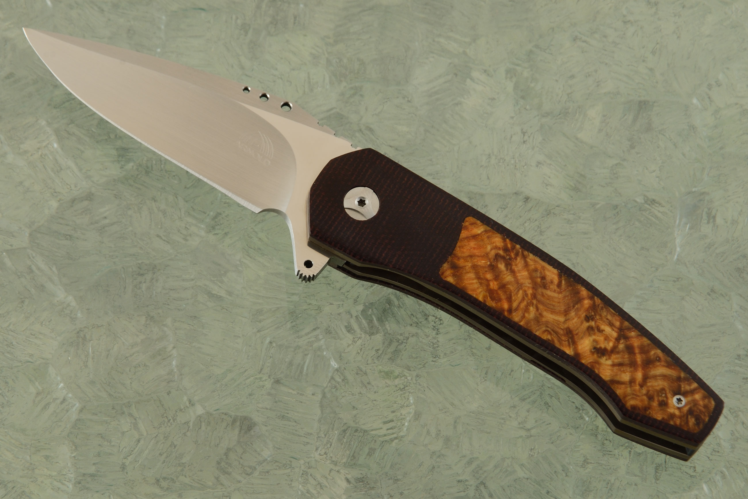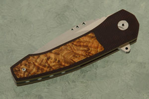 Handle scales are brown linen micarta meticulously inlaid with spalted black ash burl wood. The inlay is perfectly performed with the joints between the two materials virtually invisible. The results are stunning! The angular, domed scales are set on bronze anodized titanium liners, jewel polished on the interior. A pierced, anodized titanium pocket clip makes it easy to keep the knife close at hand. The carbon fiber backbar is inlaid with MoonGlow II (luminescent polyester). This inlay glows in the dark, making the knife easy to find even under dark conditions.