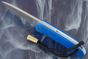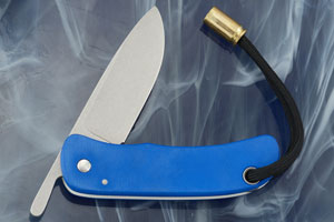 The Sakman Pointer is a custom made EDC friction folder. This one is equipped with a blue G10 handle and a stonewashed drop point blade. The simple, straightforward design offers a dependable tool for any cutting chore. It has an integral lever opener which doubles as a locking device when held down with your thumb in the open position. A paracord lanyard and a shell casing bead complete the design. Because this knife does not have a lock, it is legal in most destinations and is perfect for traveling.