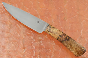 The handle is made from stabilized South African Transvaal Boekenhout wood (Faurea saligna). The wood has a similar tone to beechwood. The convoluted figure travels perfectly across the tang. Handle scales are set on the distal tapered full tang using brass pins. The handle is nicely rounded for a secure, comfortable grip.
