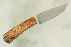 The handle is made from a burl from an indigenous South African tree. It was found in the wild and the specific species isn't known. The wood has a stunning appearance and appears to be a lacewood variety. Scales are set on the distal tapered full tang using brass pins. The handle is nicely rounded for a secure, comfortable grip.