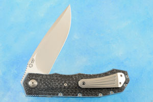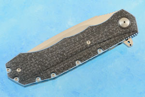 A glass bead blasted grade 5 titanium frame ensures this mid-size folder will be light in the pocket, yet have tremendous strength and durability. Each side features blue TechnoCarbo inlay. Screws throughout were made in the Arno Bernard workshop and are grade 4 titanium, allowing them to be anodized. Ensuring rigid, yet light construction, the backspacer is grade 5 titanium.
