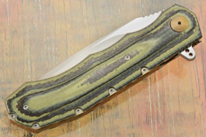 The scales are formed from layered yellow/black carbon fiber. Jimping on the thumb ramp aids grip. The flipper doubles as a front guard that keeps the hand from sliding forward onto the blade. The gently rounded handle feels sturdy and fills out the hand perfectly. It is completed with bronze anodized, fileworked titanium liners that elegantly contrast against the scales and titanium backspacer. The machined titanium pocket clip is mounted for right-handed, tip-up carry and features a ceramic ball for excellent pocket retention.