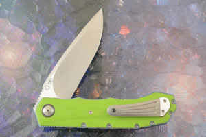 The scales are formed from 3D contoured toxic green G-10. Jimping on the thumb ramp aids grip. The flipper doubles as a front guard that keeps the hand from sliding forward onto the blade. The gently rounded handle feels sturdy and fills out the hand perfectly. The handle is completed with blue anodized titanium liners that elegantly contrast against the G10 scales. The titanium liners are hand fileworked. The pivot is surrounded by a zirconium pivot collar. The machined titanium pocket clip is mounted for right-handed, tip-up carry and features a ceramic ball for excellent pocket retention.