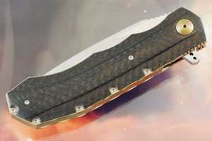 The scales are formed from 3D contoured carbon fiber. Jimping on the thumb ramp aids grip. The flipper doubles as a front guard that keeps the hand from sliding forward onto the blade. The gently rounded handle feels sturdy and fills out the hand perfectly. It is completed with bronze anodized, fileworked titanium liners and an anodized titanium backspacer. The oversized pivot is also formed from anodized titanium. The machined titanium pocket clip is mounted for right-handed, tip-up carry and features a ceramic ball for secure pocket retention.