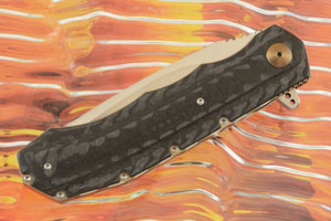 The scales are formed from 3D contoured layered carbon fiber. Jimping on the thumb ramp aids grip. The flipper doubles as a front guard that keeps the hand from sliding forward onto the blade. The gently rounded handle feels sturdy and fills out the hand perfectly. It is completed with bronze anodized, fileworked titanium liners that elegantly contrast against the carbon fiber scales and surround a matching titanium backspacer. The machined titanium pocket clip is mounted for right-handed, tip-up carry and features a ceramic ball for secure pocket retention.