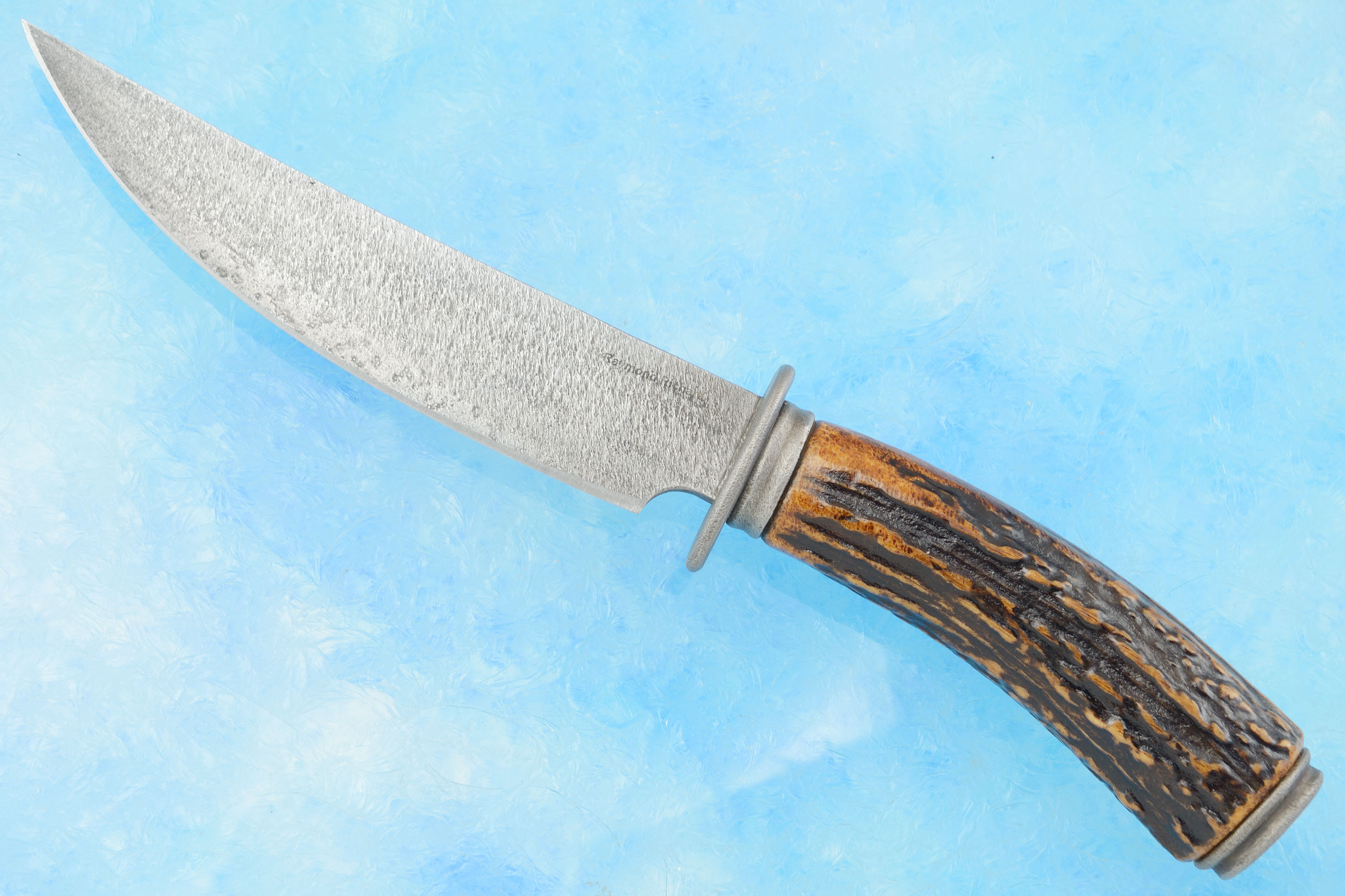 The blade is hand forged from carbon steel recovered from an antique saw blade. Ray is a true master at the forge, regularly teaching other bladesmiths better forging techniques. The blade is textured and antiqued.