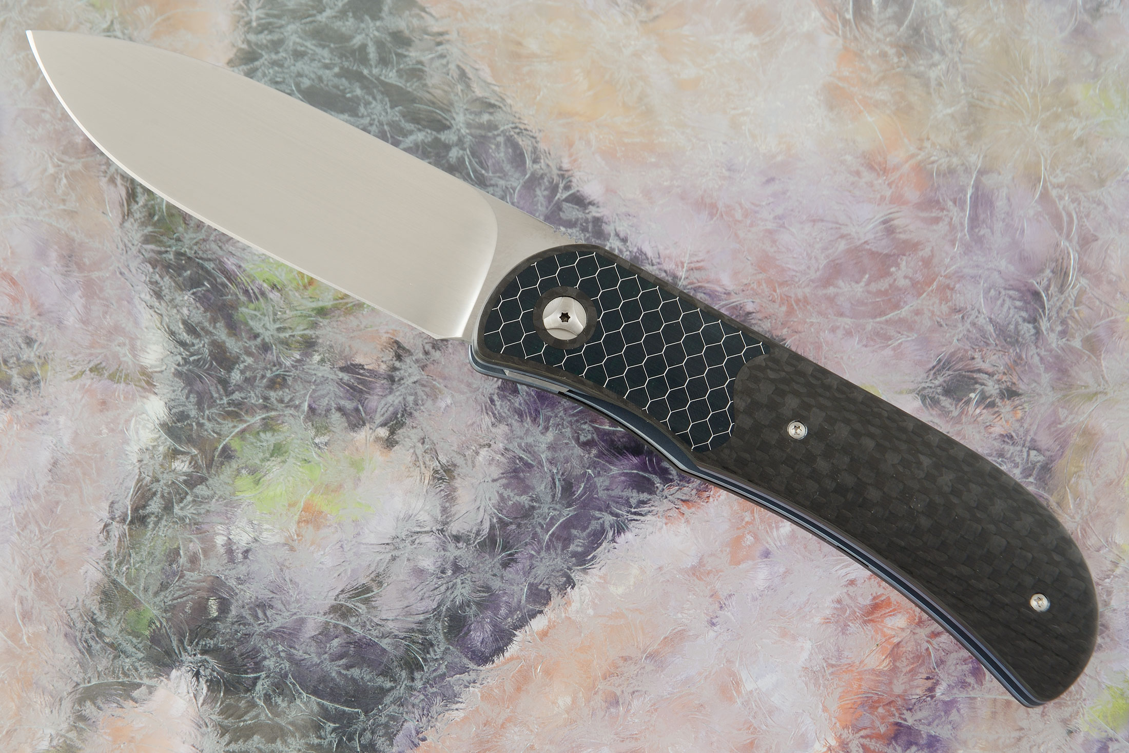 The handle is formed from carbon fiber with precision fit green C-Tek Resin infused aluminum honeycomb "bolster" inlays. C-Tek is a material that has been "in the works" since 1995. The material is absolutely stunning in its appearance and its ability to reflect light and gives a whole new depth to the knife making art. An integral carbon fiber pivot ring surrounds the custom pivot. The inlays are flawless with the transition between the two materials being nearly invisible. Blue anodized titanium liners surround the carbon fiber back spacer. The textured handle provides plenty of tactile grip. The handle is completed with a 3D machined, blue anodized titanium pocket clip mounted for right-handed, tip-up carry.